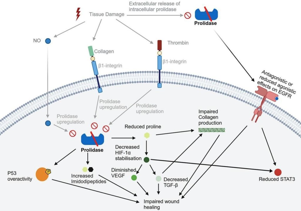 “This paper aims to provide a new paradigm for the pathophysiology of prolidase deficiency by applying these new roles of prolidase to five of the most striking symptoms in PD: Chronic ulcers, recurrent infections, SLE, dysmorphic facial features and developmental delay. These alternative functions of prolidase will be discussed and integrated with current hypotheses to allow for a more comprehensive overview of the pathophysiology of prolidase deficiency. This approach aims to enhance the understanding of prolidase overall and open new avenues for treatment.”